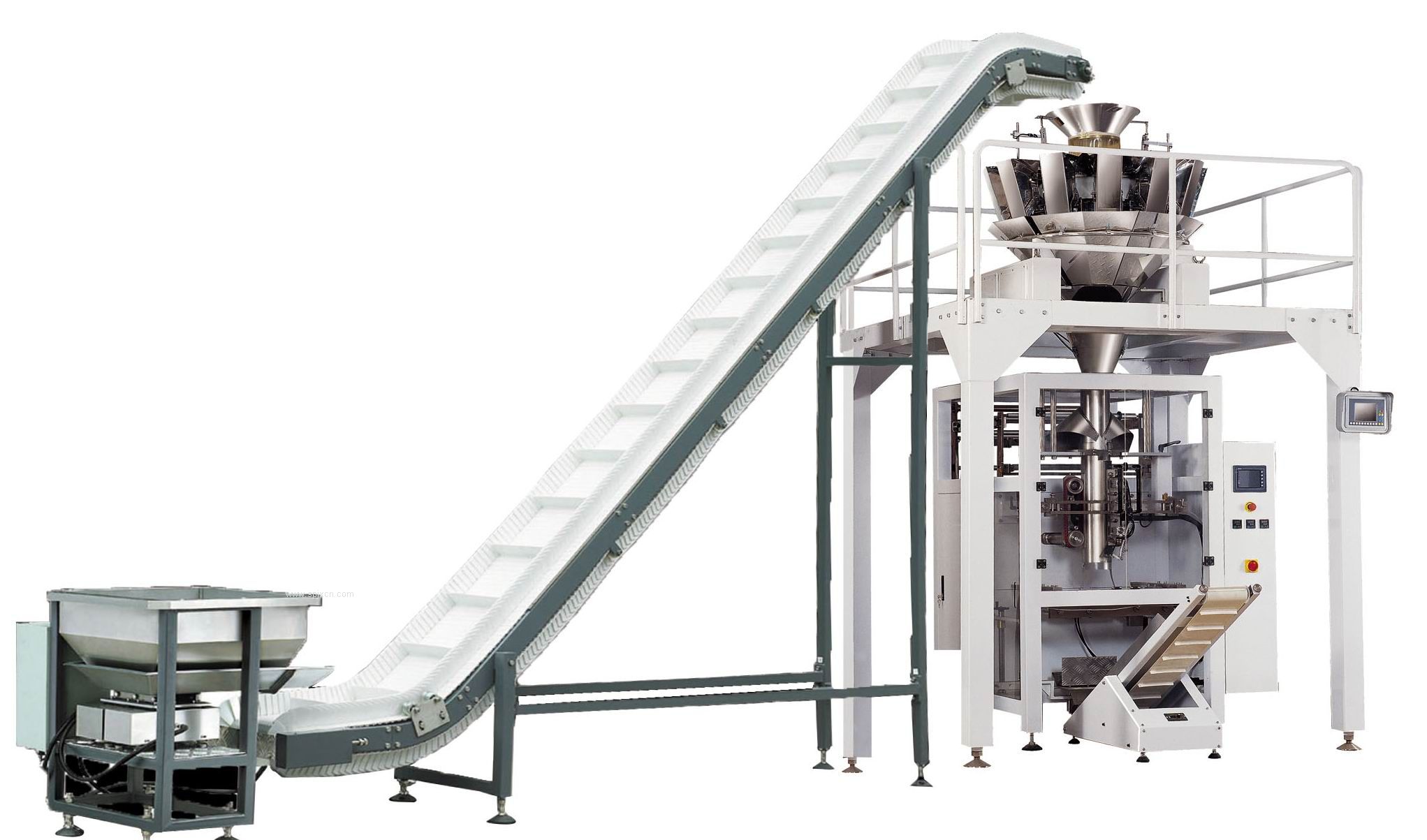 颗粒料全自动立式制袋包装机组,是由Z型提升机、电子计量组合秤、立式制袋包装机和成品输送机组成。可以包装单袋克重在30-5000g范围之间的颗粒状物料,生产企业可以根据自己的需求选择不同的包装机型号。